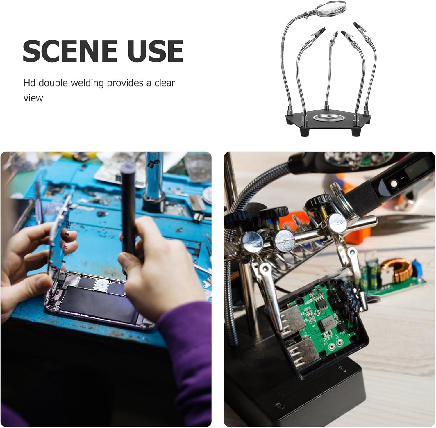 Package List 1 x Welding station Features -Material:Iron -Product Info:Welding station fixture -Color:Black -Size:26.00X18.30X18.00cm/10.22X7.19X7.07in -The design allows for adjustments, making it ideal for precision work on pcb boards during soldering tasks soldering iron stand. -With high-definition, users can enjoy view, which is for performing accurate soldering soldering arms. -This is perfect for both repair and soldering, making it an indispensable addition to professional welding table clamps. -By reducing the time and effort, this tool significantly boosts efficiency, enabling you to complete projects more quickly and helping hands soldering station. -The robust and stable clamping ensures that components are securely held in place soldering station.Goods Descriptionhelping hand The adjustable arms and clamps offer maximum flexibility, allowing you to work on projects with ease.welding repairing supplies The high-definition feature provides view, making it easier to perform detailed soldering and repair tasks on circuit boards.helping hands tool Experience convenience with our third hand soldering tool
