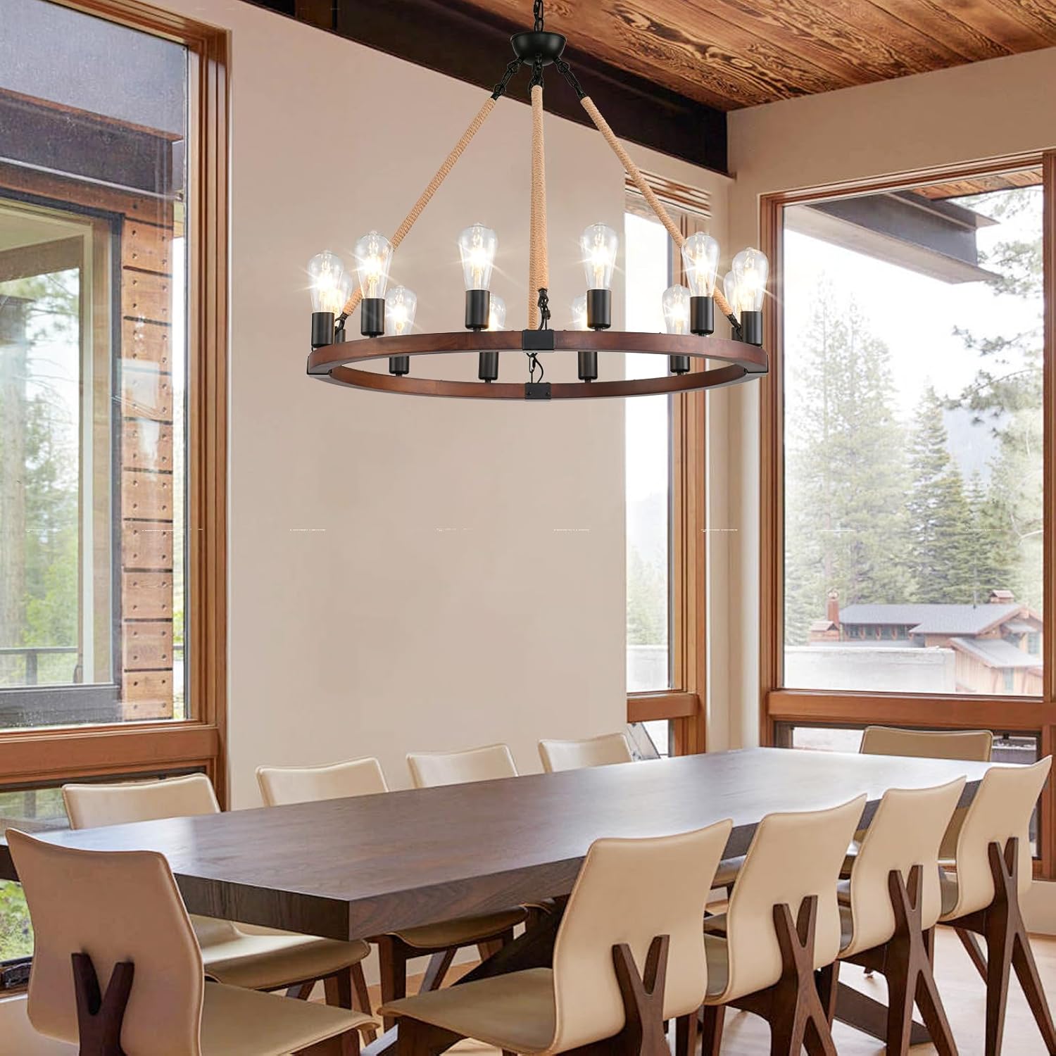 • Supreme Quality: Wood wagon wheel chandelier features a high quality, round wooden frame with a wood style finish and hemp rope boom. In addition, farmhouse wagon wheel chandelier have a thickened hardware ceiling chassis, and the surface layer is treated by painting and electroplating, which is rust proof and corrosion resistant.