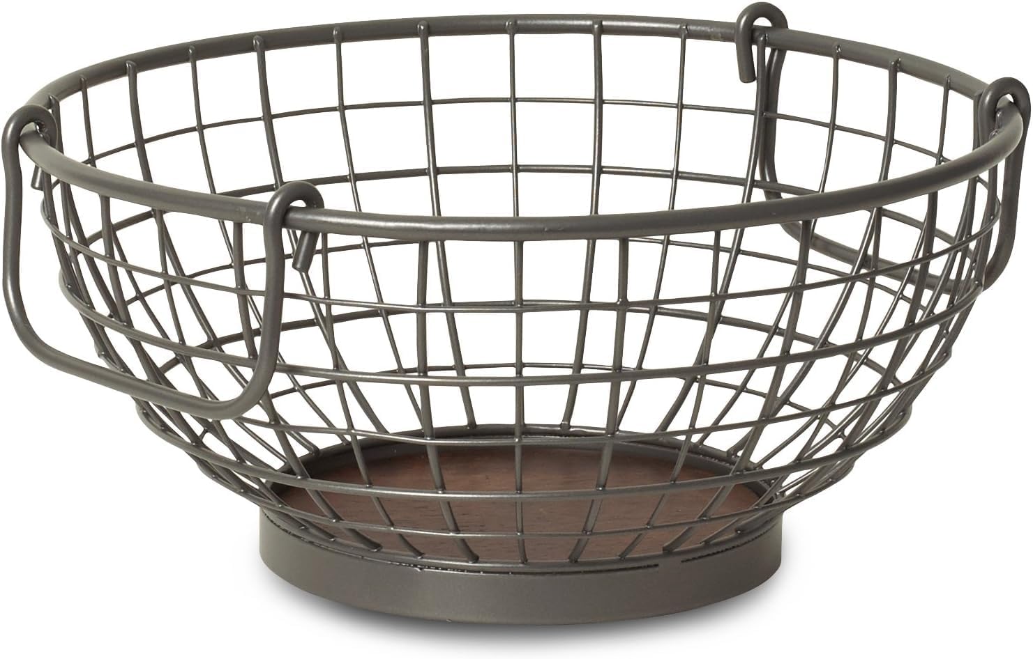 Discover the perfect blend of function and farmhouse style with the Spectrum Madison Countertop Fruit Basket. This wire fruit bowl features thick gauge steel construction and a natural wood base that brings rustic charm to your kitchen organization. The open design does more than look beautiful as it promotes airflow that helps prevent overripening and keeps your produce at peak freshness. Whether you fill this fruit basket for kitchen with seasonal favorites or display it as a decorative fruit bowl for bread and pastries it adds warmth and character to your space. The Industrial Gray color offers timeless appeal that coordinates with gray painted cabinets white countertops black or bronze cabinet pulls and warm wood cutting boards. Measuring 11 by 11 by 6 inches this fruit bowl for counter provides ample storage for families while fitting comfortably on islands tables or counters. Looped handles on each side make it easy to carry when serving or rearranging. Care requires only a damp cloth and towel dry for lasting good looks.