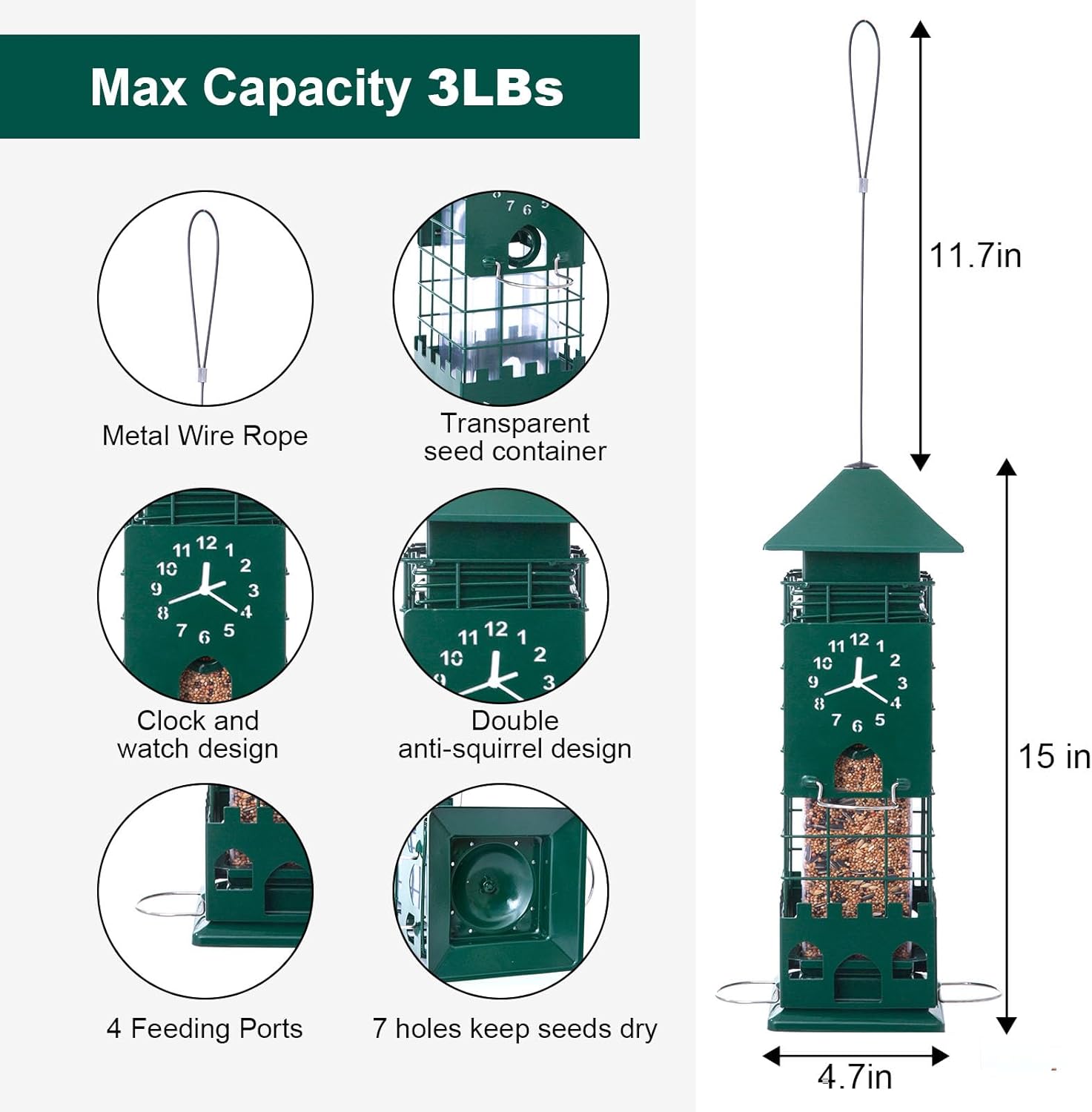 | Additional Features | Adjustable Perch, Heavy Duty, Rain Proof, Rust Resistant, Squirrel Proof |