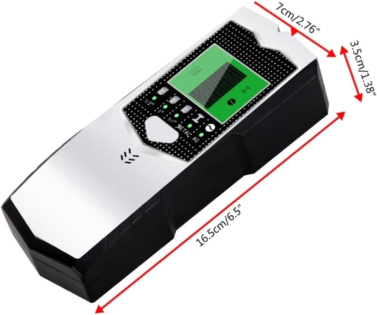 1. The wall stud finder can accurately and quickly find the edge and center of metal, studs, joists, pipes and live AC wires behind walls, floors and ceilings. Rapid detection saves users time and energy, making task completion easier.2. High visibility and comprehensive display, equipped with a bright backlit LCD display, which can show the center, edge and position of the detected studs and battery status.3. Multiple scanning modes, providing multiple scanning modes including stud scanning, depth scanning and metal scanning, allowing you to detect a variety of materials and depths.Specifications:Material: PlasticStuds Scanl: 1/2inch (12.7mm)ll: 1inch (25.4mm)Metal Scan: 2.36inch (60mm)Wire Scan: 2inch (51mm)Screen: LCD Green Backlit ScreenBattery: One 9V Battery Needed(NOT Included)Size: Approx. 6.8x2.8x1.3cm/2.68x1.1x0.51inPackage Includes:1x Wall ScannerNote:Please allow 1-2cm errors due to manual measurement, make sure that you do not mind before you order.Due to the difference between different monitors, the picture may not reflect the actual color of the item.