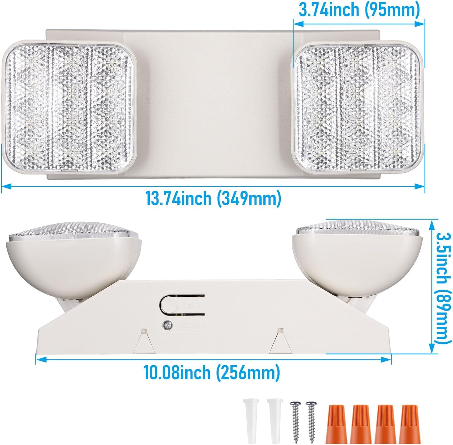 Superb Brightness and Versatile ApplicationOur LED Emergency Light stands out with exceptional brightness, offering 200lm of vivid illumination for up to 90 minutes continuously. The adjustable light heads, with their 300° horizontal and 120° vertical movement capabilities, ensure perfect beam angles for corridor, stairwell, and corner lighting needs. Operating seamlessly with both 120V and 277V input options, this light easily transitions between residential and commercial settings, making it ideal for various locations like home basements, hospitals, or malls.Top-Notch Quality and Extended DurabilityCertified by UL and FCC, this emergency light guarantees top-notch quality and long-lasting performance. Boasting a 20,000-hour lifespan, this product's impeccable build embodies reliability. With a substantial 10000mAh battery, it ensures well-lit escape routes during critical situations, delivering continuous brightness when needed the most. Coupled with a generous 2-year warranty, it provides peace of mind and assurance of lasting quality. Installation becomes a breeze with all accessories included, offering a hassle-free setup experience.SpecificationWattge: 2WInput Voltage: 120/277VBrightness: 200lmBeam angle: 120°Finish color: WhiteMaterial: ABSWaterproof rating: Damp locationWorking temp: 32°F-104°F