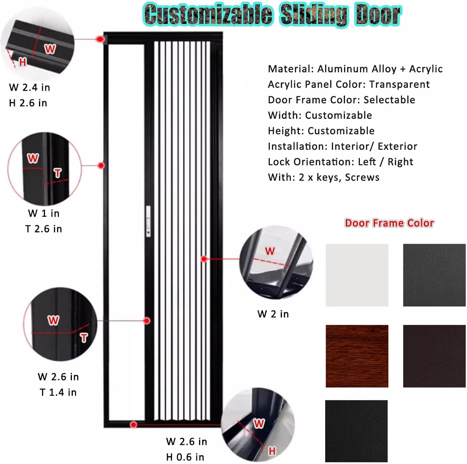 Metal Frame Indoors Security Patio Door:Transform your living space with our versatile sliding dividing doors, designed to optimize your home's layout while providing privacy and style. Whether you want to create a cozy reading nook in your bedroom, separate areas in your living room, or make the most of narrow spaces like hallways or at the top of stairs, our doors are the ideal solution. Crafted from durable aluminum and transparent acrylic, these sliding doors not only enhance your decor but also offer practical benefits. The customizable width and height ensure a perfect fit for any space, while the choice of frame colors allows you to match your unique interior design. **Key Features:** - **Space-Saving Design:** The folding accordion style allows you to maximize floor space without sacrificing functionality. - **Smooth Operation:** Equipped with a high-quality alloy pulley, our doors glide effortlessly, making access easy for everyone. - **Privacy Assurance:** The lockable feature provides a secure personal space whenever you need it. - **Customizable Options:** Tailor the doors to fit your specific needs, whether for a storage room, office, or balcony. - **Weather Resistant:** Our aluminum construction effectively blocks wind, moisture, and oil smoke, ensuring a comfortable environment. **Installation Notes:** For best results, install on a flat surface. Remember to measure accurately to ensure a seamless fit. Double doors are available for widths of 59 inches or more. Be sure to specify whether you prefer internal or external mounting and the desired handle direction. **Package Includes:** - 1 Acrylic panel door - 1 Magnetic doorpost - 1 Fixed doorpost - 1 L adjusting plate - 1 Upper track - 1 Lower track - 2 Keys - A set of screws - Hexagonal wrench - Decorative covers Upgrade your home with our stylish sliding doors that combine function and elegance, making every space more enjoyable and private.