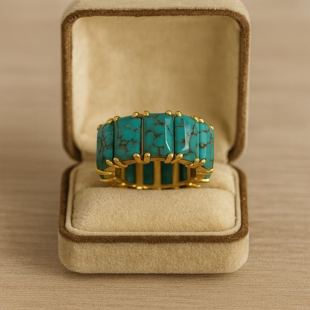Add a bold touch of natural beauty to your jewelry collection with this Turquoise Gold Eternity Band, designed for women who appreciate artistic, boho-inspired elegance. Each ring is carefully set with natural turquoise stones, celebrated for their vibrant blue-green shades and organic vein patterns that make every piece one-of-a-kind. The rich 18K gold plated setting enhances the stone’s beauty and offers a luxurious, vintage charm. Handcrafted with precision, this ring features secure, detailed prong work and a smooth inner band for maximum comfort. Whether worn as a statement ring, a stylish stackable band, or a meaningful gemstone piece, it elevates any look effortlessly—from casual outfits to festive and western-inspired attire. Arriving ready for gifting, this turquoise ring is a perfect choice for birthdays, anniversaries, holidays, or simply as a treat for yourself. A stunning blend of color, craftsmanship, and personality—this is a timeless piece every jewelry lover will adore.