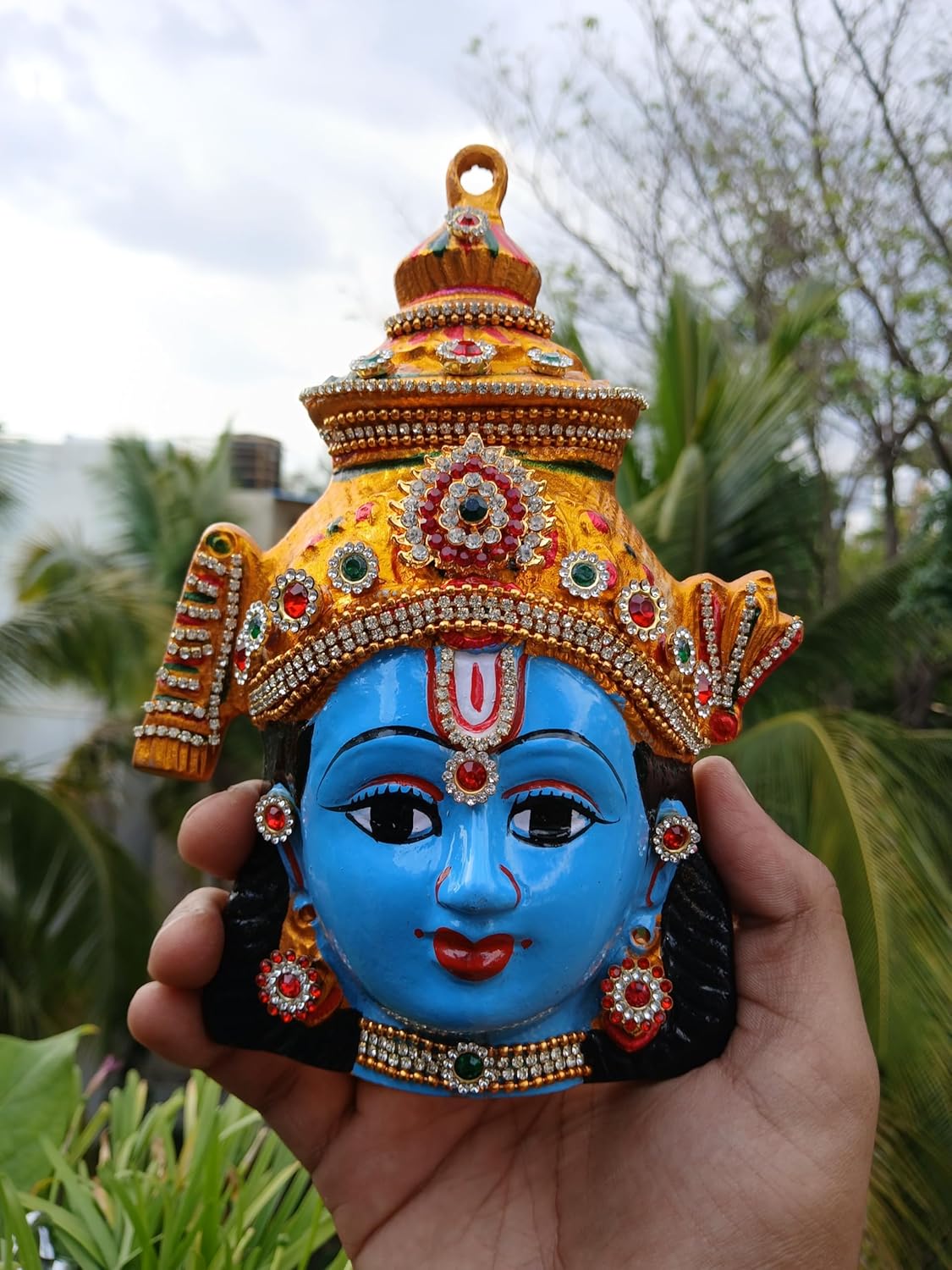 Transform your traditional pooja rituals with this exquisitely handcrafted decorative Vishnu face mask, measuring 8 x 5.5 inches. The striking blue complexion is beautifully complemented by intricate crown detailing adorned with red, green, and crystal-like embellishments. This versatile mask features three strategic holes - one for wall mounting and two for securing it to a kalasham or coconut during ceremonies. Perfect for Vaikunta Ekadashi celebrations, temple decorations, and various Hindu festivals, this piece showcases meticulous artisanship in every detail, from the serene expression to the ornate crown work. The lightweight yet durable construction ensures it can be used repeatedly for various religious occasions. The mask's traditional design elements include the distinctive tilak marking and detailed facial features that capture divine grace. Ideal for enhancing your home temple, ritual setups, or as a meaningful spiritual gift, this decorative piece adds an authentic touch to your sacred space.