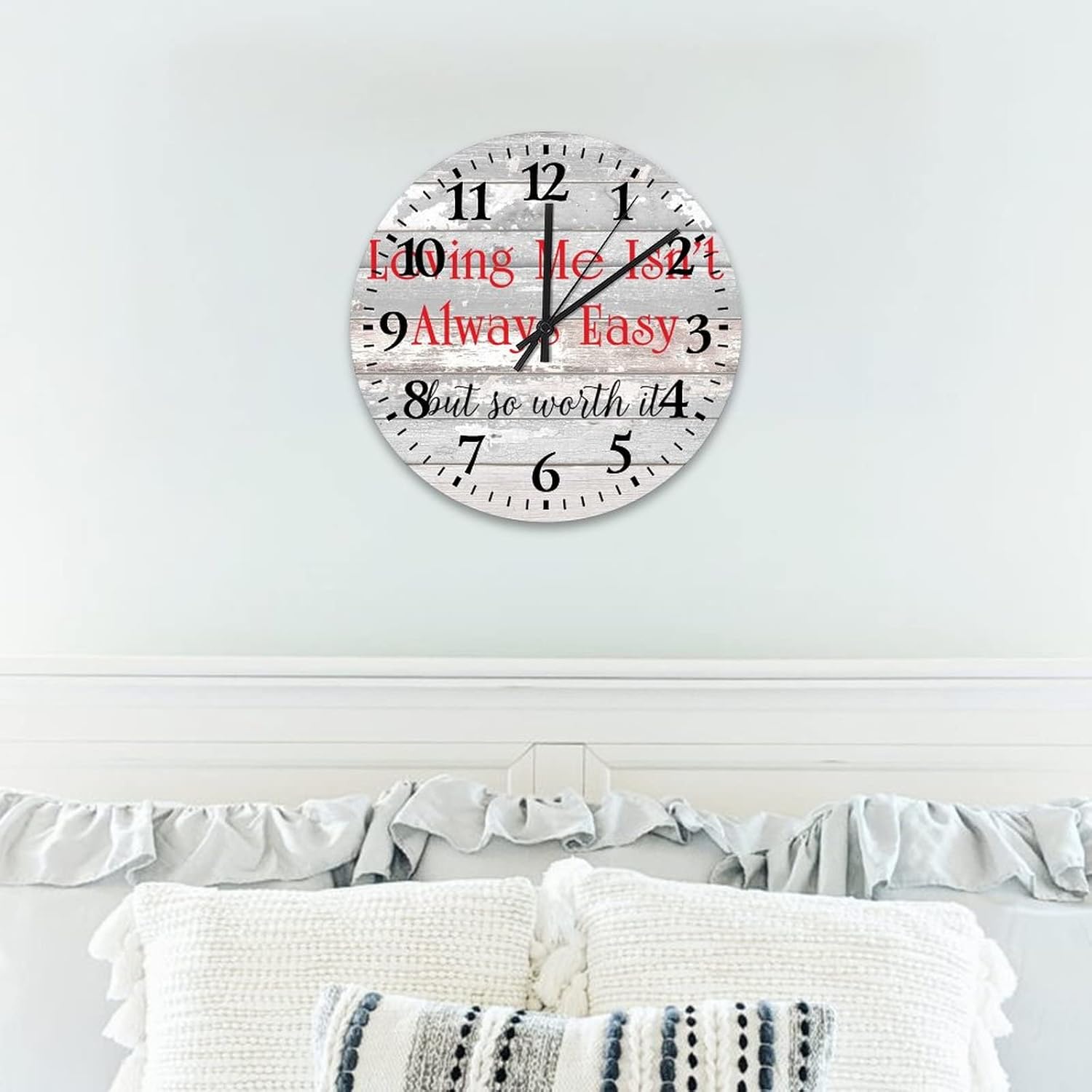 Loving Me Isnt Always Easy But So Worth It Clock Romantic Quote for Valentines Day kitchen clocks wall Quartz Movement Arabic Numbers Clock Bedroom Living Room Home Decor 12 Inch??Details:Product Size: 10/12/15 inches, (25/30/38 cm)Shape:RoundMaterial: Wood??Functional Home DécorThis Valentine's Day Decorative clock aren't just for timekeeping. They function as beautiful wall decor pieces, beyond telling time, and bring both style and purpose to any room.A charming home decoration, very suitable as a housewarming gift, making the home more warm. Suitable for any room, you can put it in any room such as home, living room, master bedroom, kitchen, bathroom, home office. Elegant, durable and stylish.??Clock Hands Troubleshooting Guide:Check that the battery is a new battery and not a used battery.Make sure the hour and minute hands are not crossing or touching each other. If they are, adjust the hands by slightly bending them.See if the center pin that holds the hands together is firmly pushed in or screwed on, depending on the style.If hands are still not moving after the above, please reference the hands replacement instructions included with all of our open face clocks.